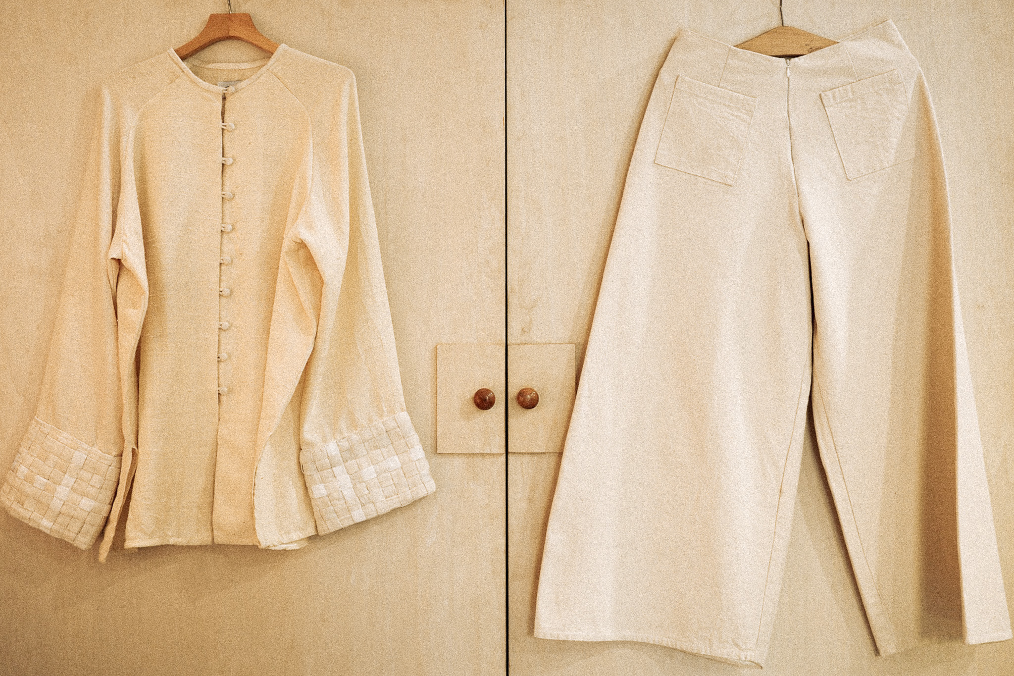 Tay áo được xử lý bằng kỹ thuật đan tay ba chất liệu — dây may, dây lộn, dây thô — giao cắt như cách các lớp nguyên liệu được phối trong một món ăn.