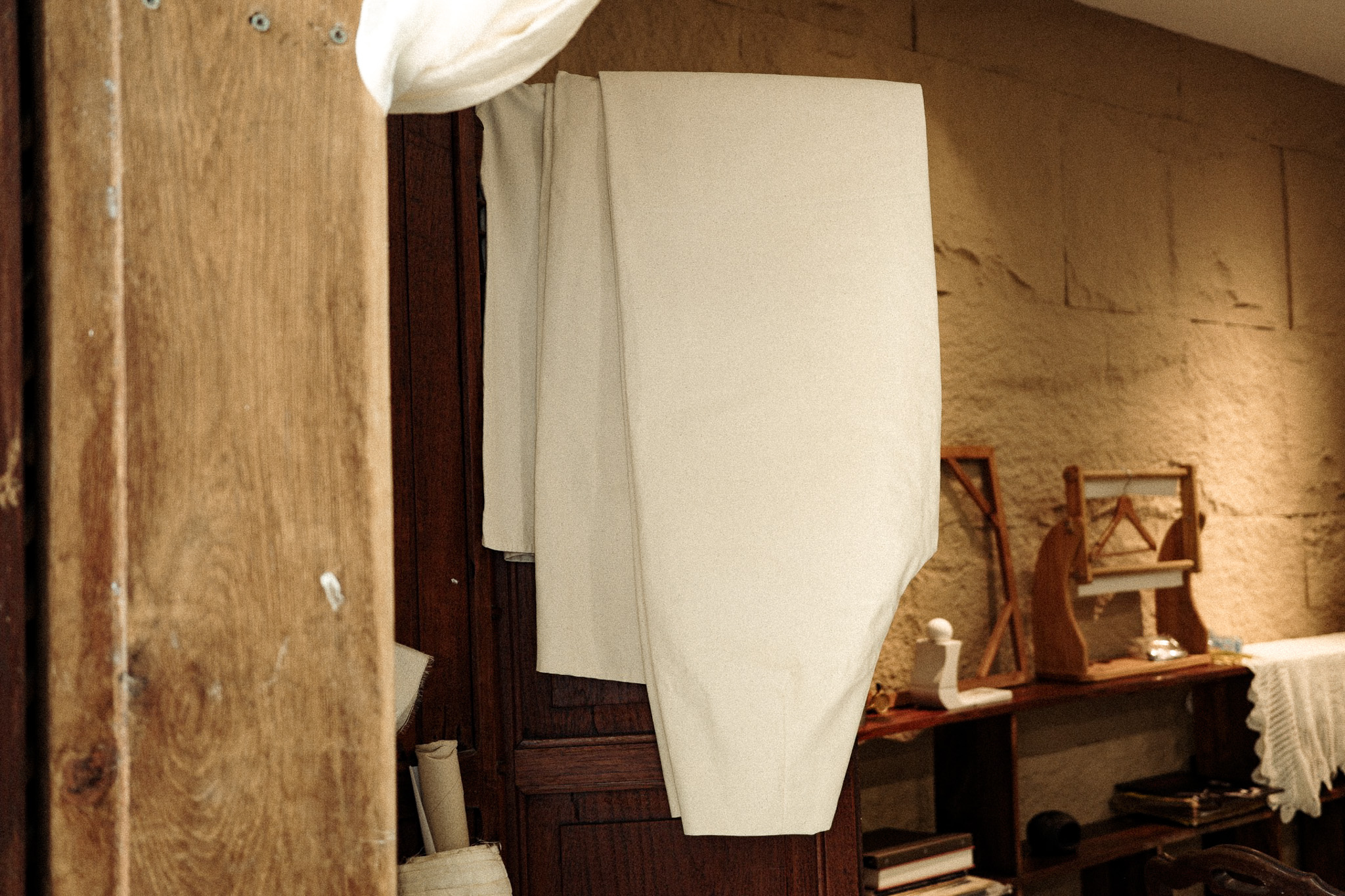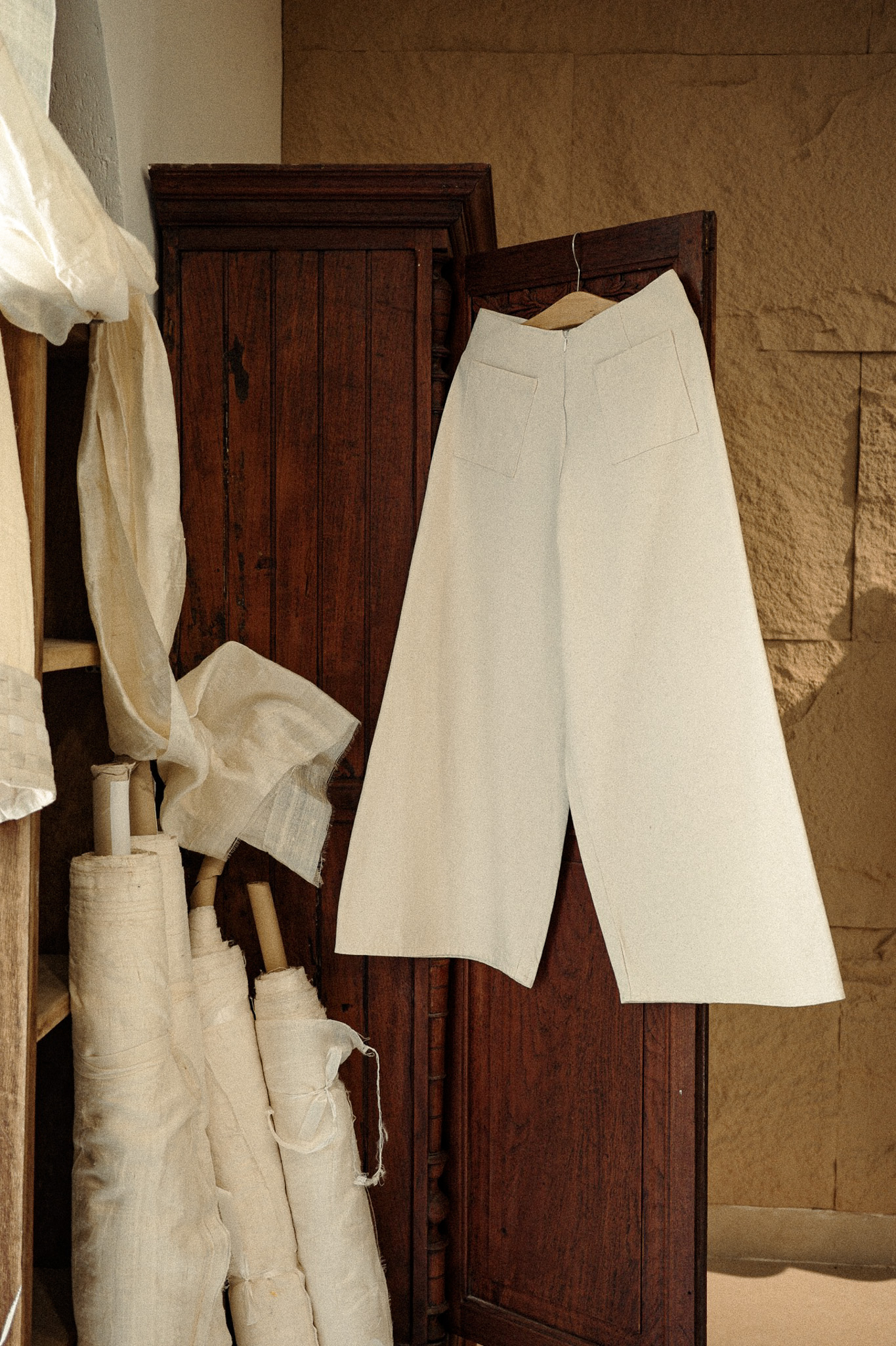 Lụa tơ tằm Việt Nam, dệt tay, giữ nguyên sắc trắng ngà của kén – một bề mặt còn nguyên độ thô, gồ ghề, chưa xử lý.
